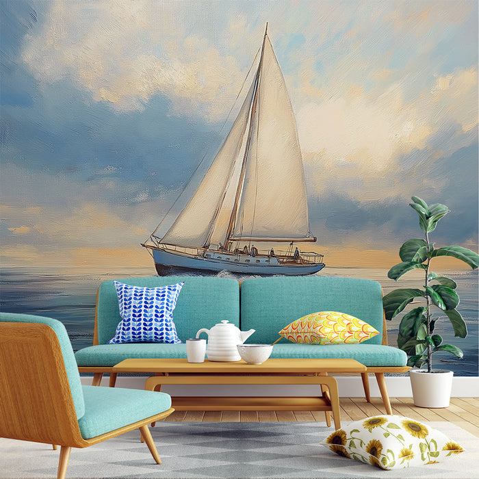 Transformirajte svoj prostor s našim prekrasnim muralnim tapetama na kojima je jedrilica koja plovi mirnim vodama. Bijela jedra graciozno plutaju na vjetru, dok ih zlatno svjetlo zalaska sunca osvjetljava nebo, stvarajući umirujuću i sanjivu atmosferu. Nijanse plave i narančaste harmonično se stapaju kako bi unijele dodir spokoja i topline u vaš interijer.