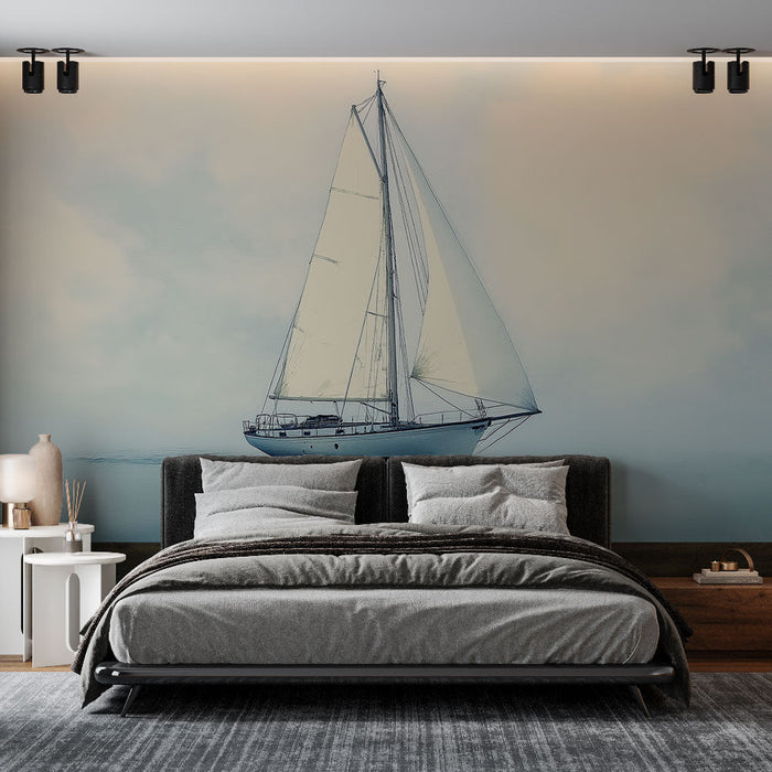Ova muralna tapeta prikazuje umirujući prizor s elegantnom jedrilicom koja plovi mirnim vodama ispod mekog, oblačnog neba. Blage nijanse plave i bijele stvaraju mirnu atmosferu, savršenu za donošenje dodira spokoja u vaš unutrašnjost.