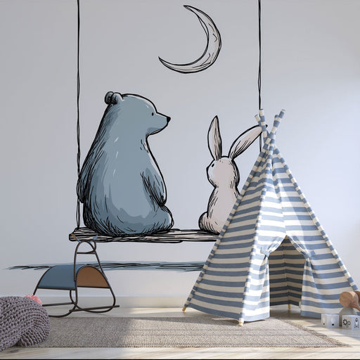 WonderMuralEz a elbűvölő tapéta egy gyönyörű kék medve és egy bézs nyúl békés hintázását ábrázolja a hold fénye alatt. Ennek a jelenetnek a puha és nyugtató h...