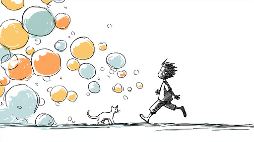 WonderMuralA gyönyörű fotótapetánkon egy boldogan futó gyermek látható egy macskával, színes buborékokkal körülvéve narancssárga, kék és sárga árnyalatokban....