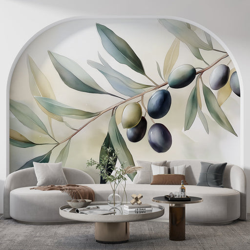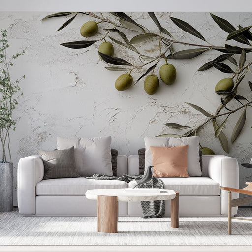 WonderMuralEz a lenyűgöző falfestmény egy elegáns olajágat ábrázol, amelyet zöld gyümölcsök és modern levelek díszítenek. A lágy háttér harmonikusan illeszked...