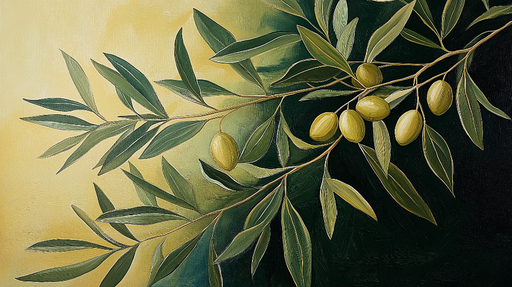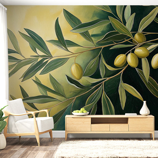 WonderMuralEz a falfestmény egy csodálatos olajágat emel ki, amelyet zöld olajbogyók díszítenek, természetes és meleg légkört teremtve. A földes barna háttér ...