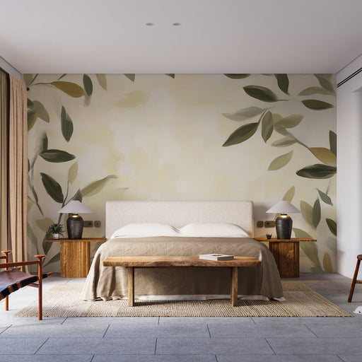 WonderMuralFedezze fel a tapétánkat, amelyen stilizált levelek finom mintája látható, nyugtató zöld és arany árnyalatokban, tökéletes harmóniában egy krémszín...