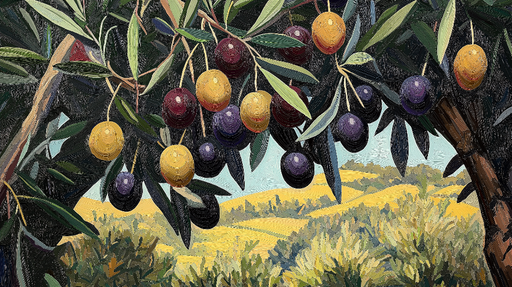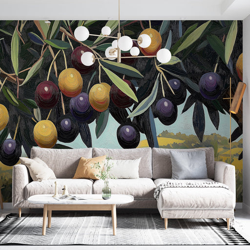 WonderMuralEz a falfestmény lenyűgöző illusztrációt kínál, amely egy olajbogyókkal megrakott olajfát ábrázol, ahol a sárga, zöld és lila árnyalatai meleg és m...