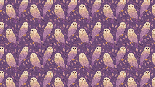 WonderMuralEz a elbűvölő Tapete stilizált baglyokat ábrázol ágakon ülve, lombbal körülvéve gazdag lila háttér előtt. A lágy levendula és krém árnyalatok meleg...