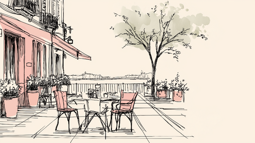 WonderMuralEz a tapéta egy bájos ábrázolást mutat egy kültéri teraszon, amely felidézi a vízparti kávézó nyugalmát. A részletek, a fém székektől a dús virágcs...