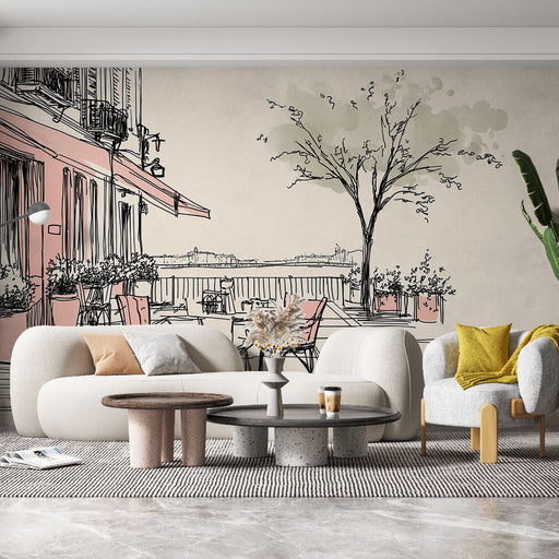 WonderMuralFedezze fel a kávézó teraszok által inspirált falmatricánkat, melyen egy stílizált illusztráció látható asztalokkal és székekkel, gyönyörű virágzó ...