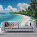 Fedezze fel a falfestmény tapétánkat, amelyen egy idilli trópusi strand látható, aranyló homokkal, amelyet türkizkék vizek simogatnak. A jelenet nyugalmat áraszt a dús pálmafákkal és a fényes kék égen úszó bolyhos felhőkkel, tökéletes pihentető légkört teremtve belső teréhez.