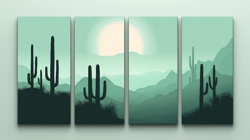 WonderMuralTapétánk egy gyönyörű mintázatot ábrázol stilizált kaktuszokkal, amelyek egy fokozatosan változó hegyvidéki tájban vágódnak ki, puha fényben fürödv...