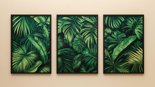 WonderMuralRemek Mural Wallpaperünk gyönyörű festményhármas motívumokkal díszített, dús növényzet ábrázolásával. Minden panel zöld árnyalataival és finom aran...