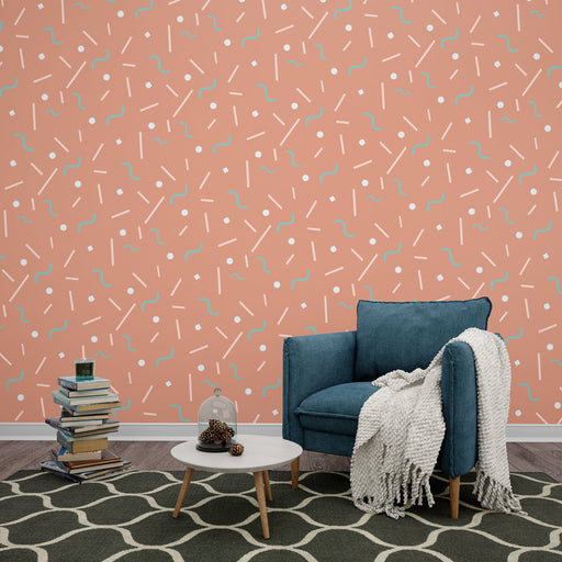 Studio SamaAdj hozzá egy retro és játékos érintést a belső térhez ezzel a geometrikus mintázatú tapétával barack színben. Fehér és kék formákkal tarkítva vidá...