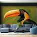 Ez a falfestmény tapéta egy lenyűgöző stilizált tukán portrét ábrázol, kiemelve élénk tollazatát és nagy színes csőrét. A fekete és narancs árnyalatai tökéletesen keverednek a zöld háttérrel, trópusi és dinamikus légkört teremtve. Ez a művészi dizájn ideális arra, hogy egzotikus hangulatot kölcsönözzön a térnek.