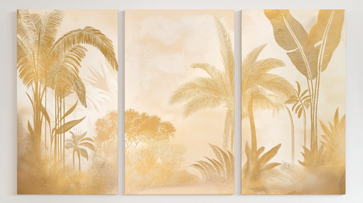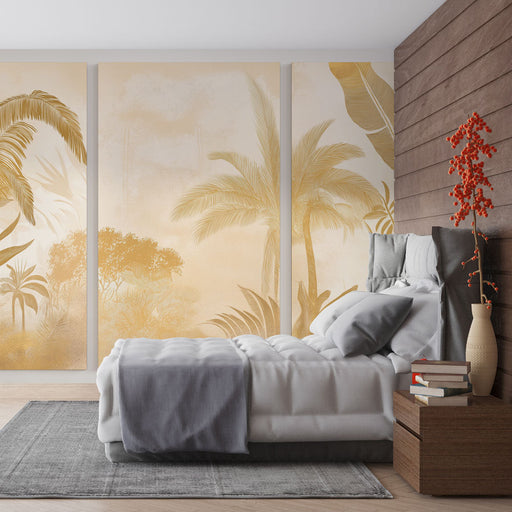 WonderMuralA mi fotótapetunk gyönyörű trópusi tájat mutat be arany színekben, amely nyugalmat és egzotikumot idéz. A pálma levelek és cserje sziluettek harmon...
