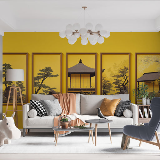 WonderMuralErre az eredeti tapétánk inspiráló japán tájat mutat be, ahol egy hagyományos pavilon körül finom növényzet található. A háttér sárga árnyalatai el...