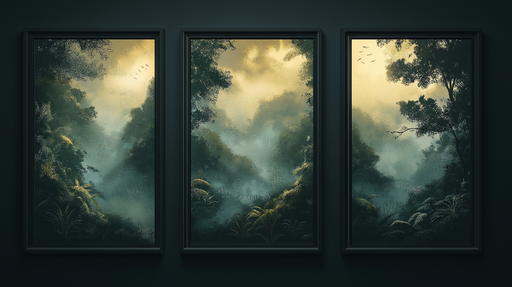 WonderMuralEredeti falmatricánk egy ködbe burkolózó erdőt ábrázoló triptych, mely misztikus és nyugtató atmoszférát teremt. A sötétzöld árnyalatok arany fénye...