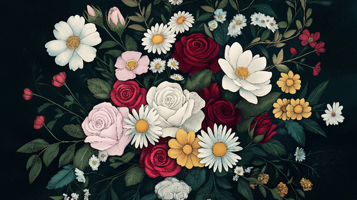 WonderMuralEz a falfestmény tapéta egy pompás sokszínű virágcsokrot ábrázol, a szenvedélyes vörös rózsáktól a finom fehér és sárga százszorszépekig. A sötét h...
