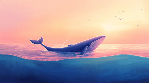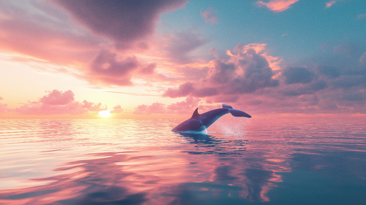 WonderMuralEz a falfestmény egy fenséges bálna úszását ábrázolja békésen egy nyugodt tenger felszínén, egy naplemente alatt, amely lágy rózsaszín és narancssá...