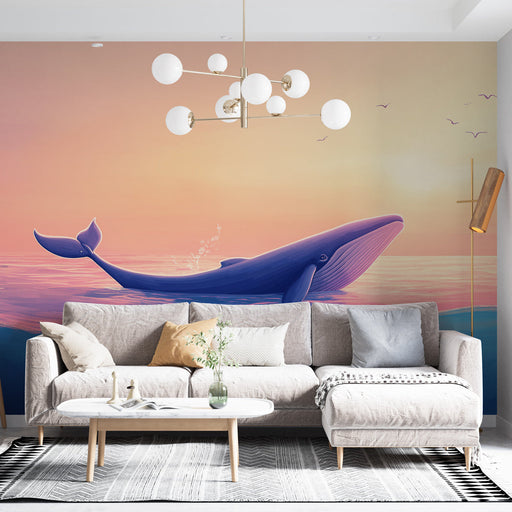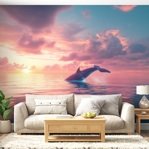 Teljes részletek megtekintéseFalfestmény tapéta bálna | Egy fenséges bálna egy megnyugtató naplemente alatt