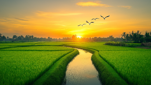 WonderMuralEz a falfestmény egy buján zöld rizsföldek táját ábrázolja, amelyet egy látványos naplemente arany fénye világít meg. A rizsföldek élénk zöld árnya...