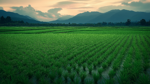 Teljes részletek megtekintéseRizsföldek tájképe | Buján zöld rizsföldek naplementekor