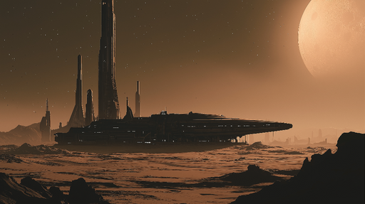 WonderMuralEz a falfestmény drámai kilátást nyújt egy fenséges űrhajóra sziluettben, amely szilárdan áll a durva földönkívüli terepen, egy tágas ég alatt, ame...