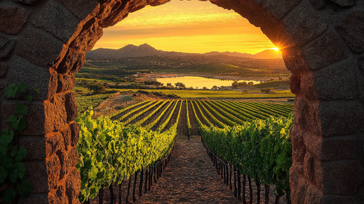 WonderMuralEz a fali tapéta csodálatos panorámás kilátást nyújt a szőlőskertekre, amelyeket a naplemente arany fénye fürdet, meleg és nyugodt légkört teremtve...