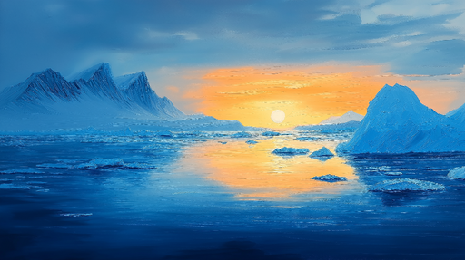 WonderMuralEz az elbűvölő falfestmény egy fenséges sarki jelenetet ábrázol, ahol a lenyugvó nap tükröződései megvilágítják a befagyott óceánt. A kék árnyalata...
