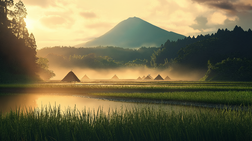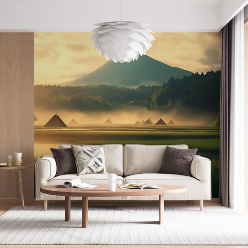 WonderMuralEz a bájos falfestmény egy elbűvölő vidéki tájat ábrázol, ahol a naplemente tükröződik a buja rizsföldeken, amelyeket fenséges hegyek vesznek körül...