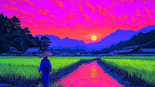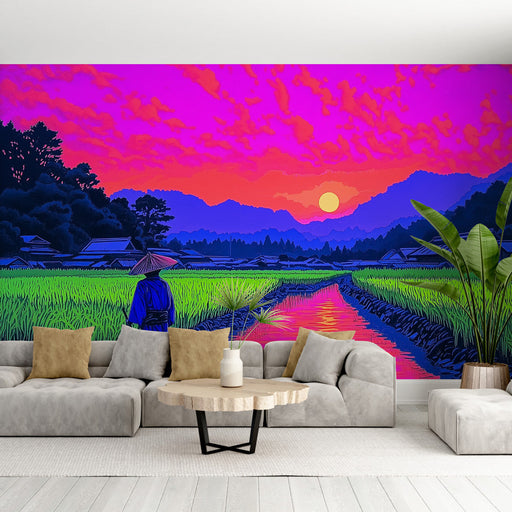 WonderMuralEz a lenyűgöző falfestmény tapéta egy stilizált rizsföldi tájat ábrázol, amelyen egy gazda sziluettje látható, ahogy a vízben dolgozik egy lenyűgöz...