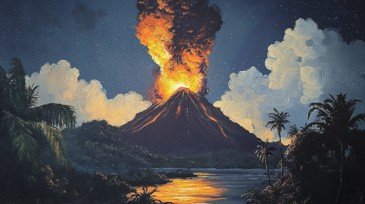 WonderMuralEz a lenyűgöző falfestmény egy látványos vulkáni kitörést mutat be, amelyet a naplemente meleg árnyalatai világítanak meg. Az kitörő vulkán és a cs...