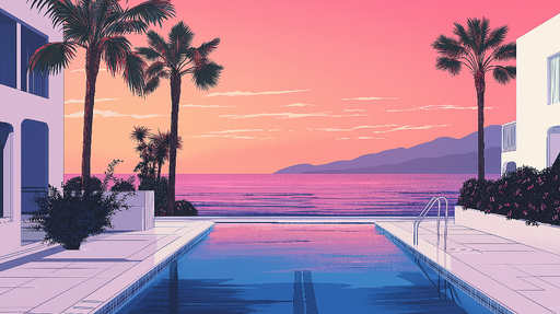 WonderMuralA tapétánk lenyűgöző naplementét idéz, rózsaszín, narancssárga és lila pasztell árnyalatai tükröződnek egy nyugodt medencében. A háttérben lévő pom...
