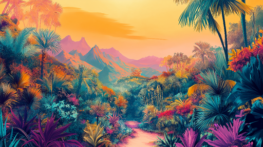 Teljes részletek megtekintéseFotótapé dzsungel színes | Élénk trópusi táj naplementekor