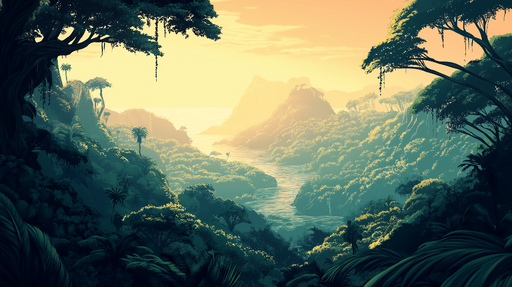 WonderMuralEz a művészi falfestmény tapéta lenyűgöző ábrázolást nyújt egy trópusi dzsungelről, amelyet egy naplemente arany fénye világít meg. A sűrű lombkoro...