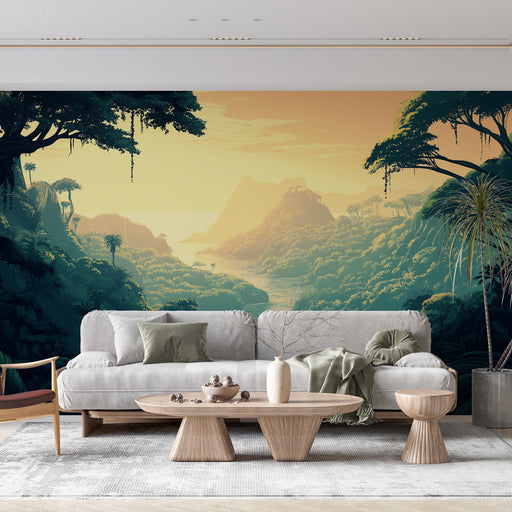 Teljes részletek megtekintéseFalfestmény tapéta trópusi tájkép | Nyugtató kilátás egy buja dzsungelre naplementekor