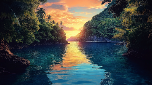WonderMuralA tapétánk egy vibráló trópusi naplementét ábrázol, rózsaszín, narancssárga és lila árnyalatokkal, melyek harmóniában tükröződnek egy kristálytiszt...