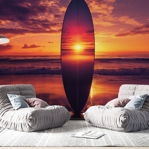 WonderMuralA mi élénk falfestmény tapétánk egy szörfdeszkát ábrázol, amely a homokon áll, és egy pompás naplemente keretezi. A narancs és lila meleg árnyalata...