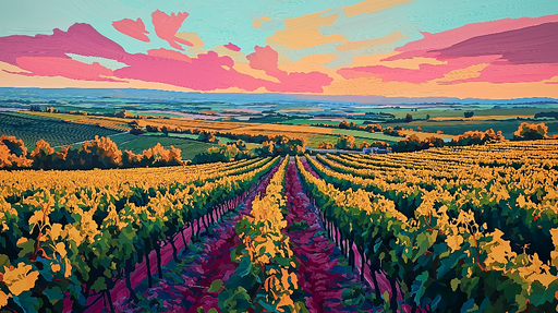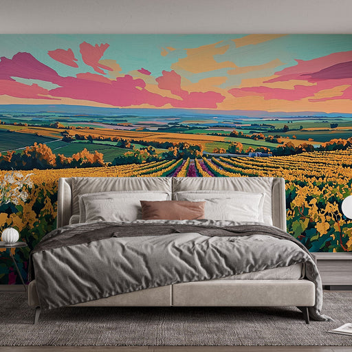 WonderMuralEz a művészi falfestmény egy színes szőlőültetvényt ábrázol, amelyet egy naplemente arany fénye fürdet. A buja szőlősorok ameddig a szem ellát, ara...