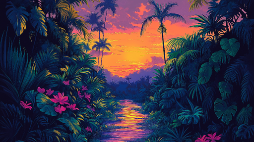WonderMuralA mi tapétánk gyönyörű trópusi naplementét ábrázol, ahol a rózsaszín és arany meleg színei egy csendes folyón tükröződnek. A pálmafák és buja növén...