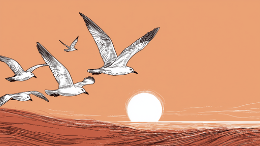 WonderMuralRemek fotó tapétánkon elegánsan rajzolt sirályok repülnek teljes erővel, egy narancssárga háttér előtt, amely egy gyönyörű naplementét idéz. Az eny...