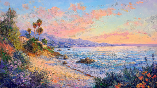 WonderMuralA mi falfestményünk egy modern part menti tájat ábrázol, amelyen egy elegáns villa látható egy végtelen medencével, mindez puha kék és rózsaszín ár...