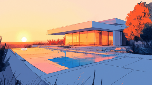 WonderMuralTapétánk lenyűgöző illusztrációt mutat be egy modern házról, amelyet egy tükörsima medence kísér, a naplemente puha fényében fürdve. Az narancssárg...
