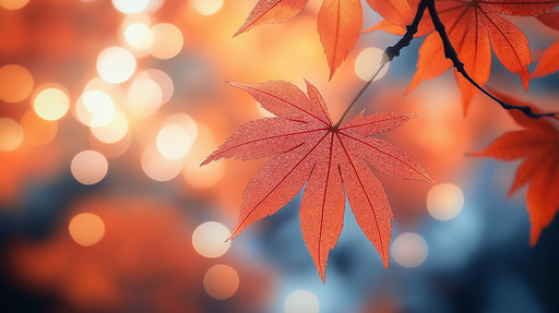WonderMuralEz a falfestmény kiemeli az élénk vörös juharlevélet, amely finoman lóg az ágáról, elmosódott háttér előtt, meleg és világos árnyalatokkal. A naran...