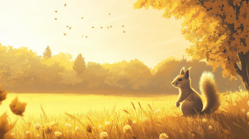 WonderMuralEz a falfestmény tapéta finoman illusztrált mókust ábrázol, amely egy arany mezőben ül a meleg napsugár alatt. Az őszi levelek narancs és sárga árn...