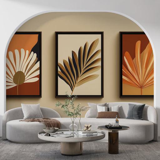 Teljes részletek megtekintéseFalfestmény tapéta őszi levelek | Modern levélminták narancs és fekete színben