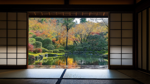 Teljes részletek megtekintéseFalfestmény zen kert | Megnyugtató kilátás a természetre őszi színekkel