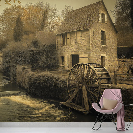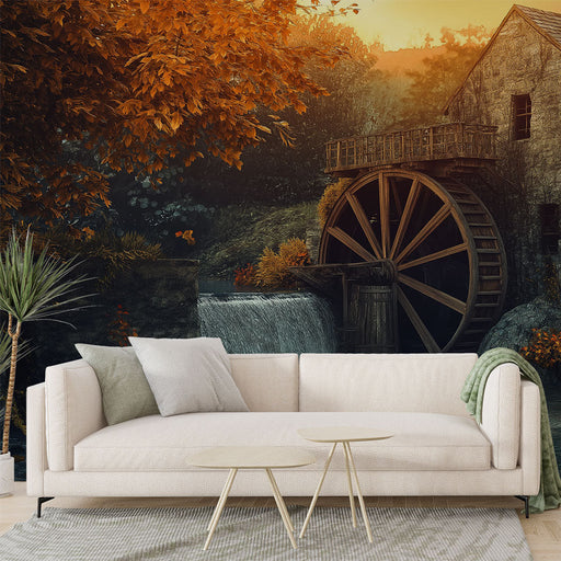 Teljes részletek megtekintéseFalfestmény tapéta régi malom | Egy megnyugtató jelenet egy vízimalommal őszi környezetben