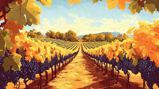 WonderMuralEz a tapéta kiemel egy csodálatos szőlőültetvényt ősszel, ahol az aranyszínű levelekkel és fekete szőlőfürtökkel teli szőlőtőkék ameddig a szem ell...