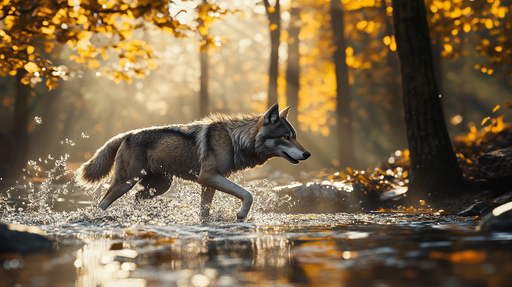Art'loloEz a erdei farkas tapéta megragadja a farkas vad szépségét, amint átkel egy patakon az őszi fényben fürdő erdőben. Aranyszínű leveleivel és békés h...