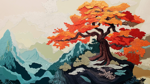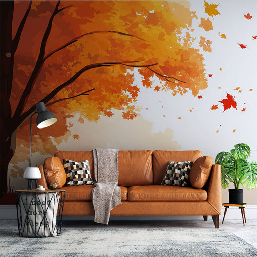 WonderMuralEz a lenyűgöző tapéta egy fenséges őszi fát helyez a középpontba, amelynek lángoló narancs és vörös levelei kontrasztot alkotnak egy stilizált hegy...
