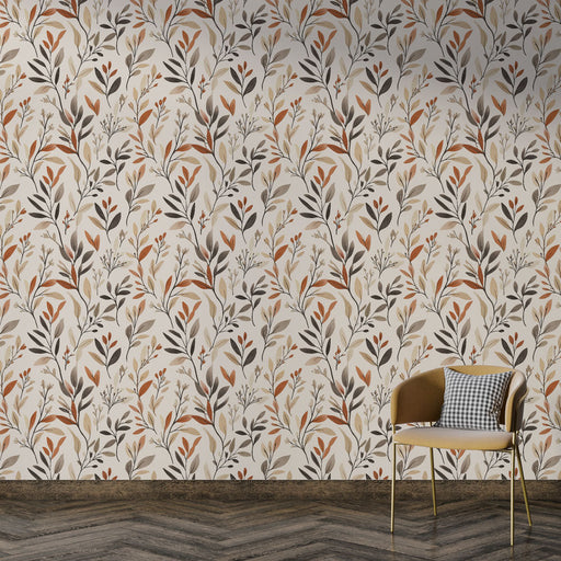 Teljes részletek megtekintéseVirágos tapéta őszi árnyalatokkal | Törékeny levelek és virágok mintái egy tejszínű háttéren